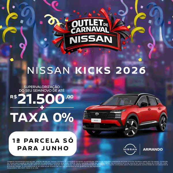 Imagens meramente ilustrativas. Oferta válida por tempo limitado ou enquanto durarem os estoques. Condição de tabela Fipe no seminovo mediante avaliação prévia, laudo cautelar, todas as revisões feitas na concessionária da marca do veículo, média de 10.000 km rodados ao ano, ano de fabricação 2022 ou superior e sem avarias mecânicas ou na lataria. Sujeito à análise de crédito. Consulte todas as demais condições na concessionária Armando Nissan. A concessionária se reserva ao direito de corrigir possíveis erros gráficos ou de digitação. Desacelere. Seu bem maior é a vida.